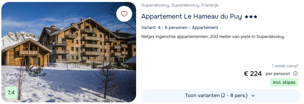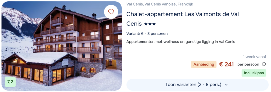 Ook bij Chalet.nl boek je inclusief skipas! De deals die we voor je hebben geselecteerd zijn allemaal voor 1 week en kosten minder dan € 300,- per persoon. Bij Chalet.nl zijn er alleen aanbiedingen in Frankrijk voor onder de € 300,-.