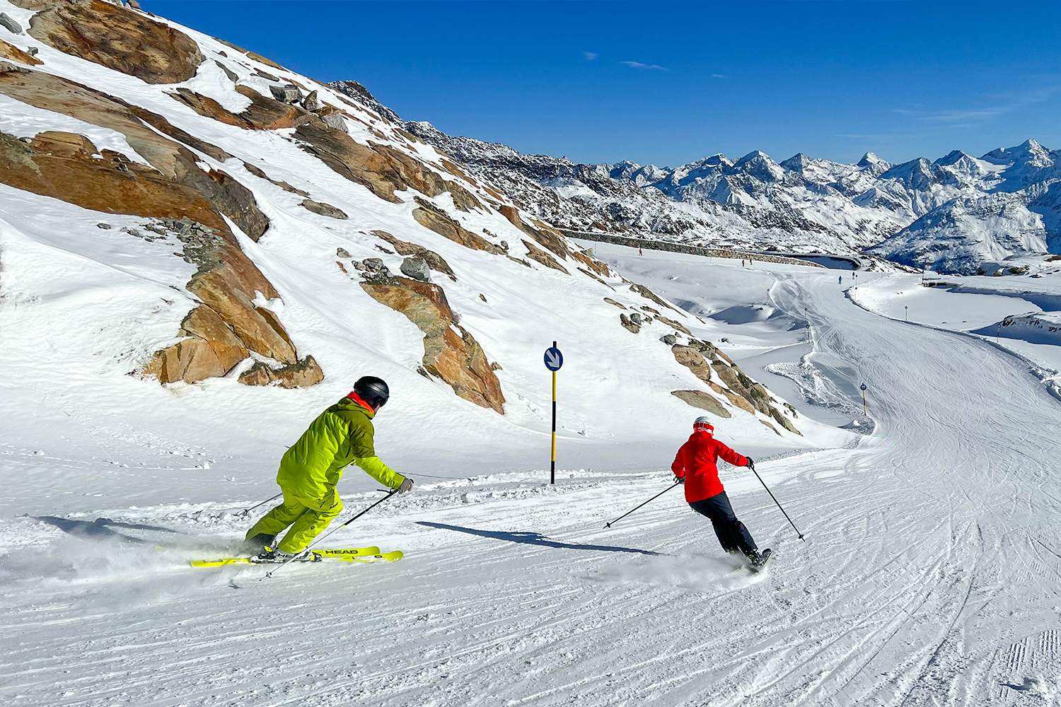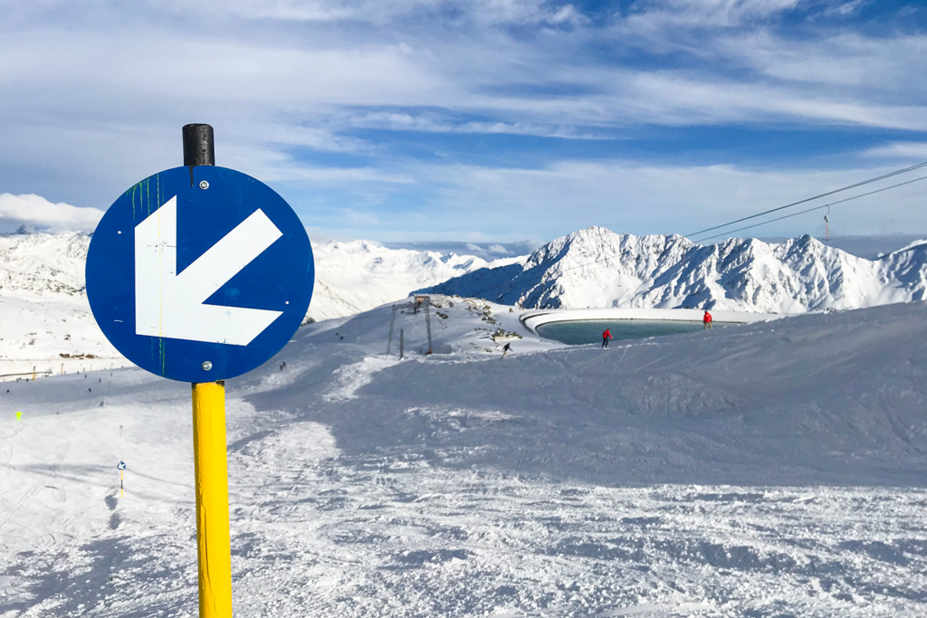 De blauwe 38 ligt bovenop de Tiefenbachgletscher. Als je helemaal boven bent op 3370 meter moet je natuurlijk eerst even genieten van het uitzicht. Dan kun je een foto maken voor de Big 3 foto Rallye (fotopunten in Sölden op de 3 drieduizendertoppen). Daarna staat je een prachtige brede blauwe piste te wachten. Geniet van de mooie afdaling waar je goed kunt carven!