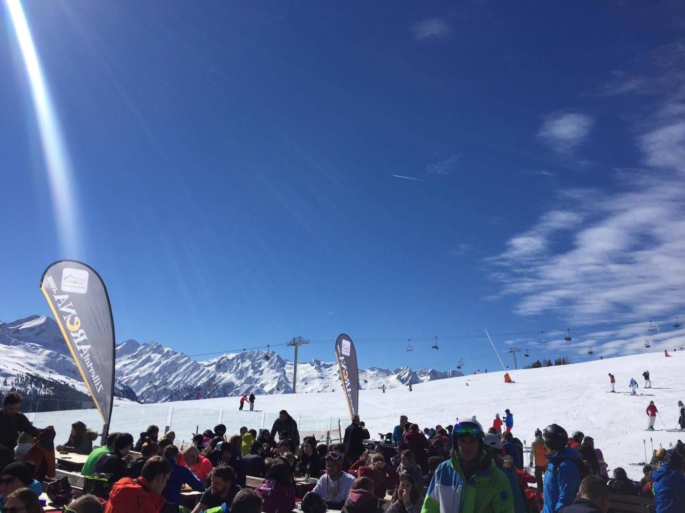 De zon moest vanmorgen nog even flink werken om de wolken weg te branden, maar rond 10.30 uur was alle bewolking verdwenen. De terrassen lopen dan ook vol met toeristen die genieten van de zonnige condities. De temperatuur loopt gedurende de dag op tot circa 10 graden boven nul op veel plekken in Oostenrijk. Veel te warme weersomstandigheden waarbij de laaggelegen pistes aan het einde van de dag papperig zijn.