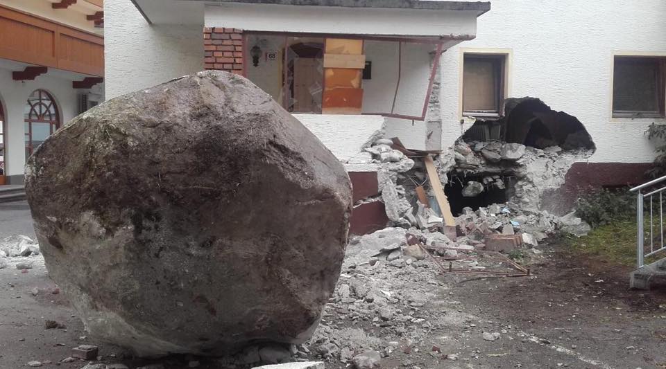 De steen viel zo’n 500 meter naar beneden en kwam in het dorp tegen het hotel tot stilstand. Het hotel aan de dorpsstraat liep flinke schade op, zoals je op de foto kunt zien. Er raakte gelukkig niemand gewond.