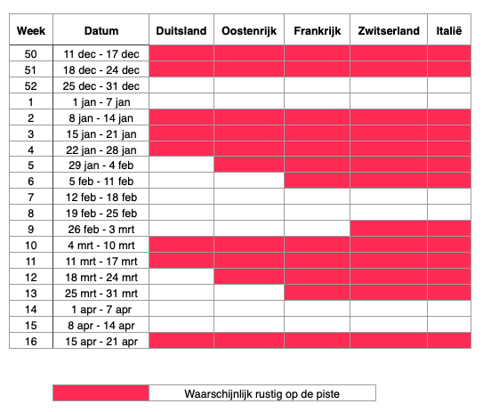 Rustige weken wintersport 2023/2024 in per land