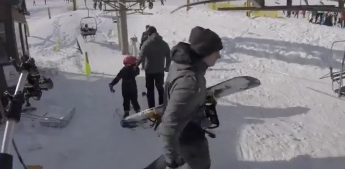 Doordat de snowboarder in de weg loopt wordt het stoeltje afgeschoten richting de twee die staan te wachten om in te stappen. Het kindje dat staat te wachten wordt daardoor gelanceerd. Heftig! Ik vraag met sterk af waarom de snowboarder daar überhaupt loopt. Het is nou niet heel logisch om die kant op te lopen toch? Ik hoop dat het goed is afgelopen!