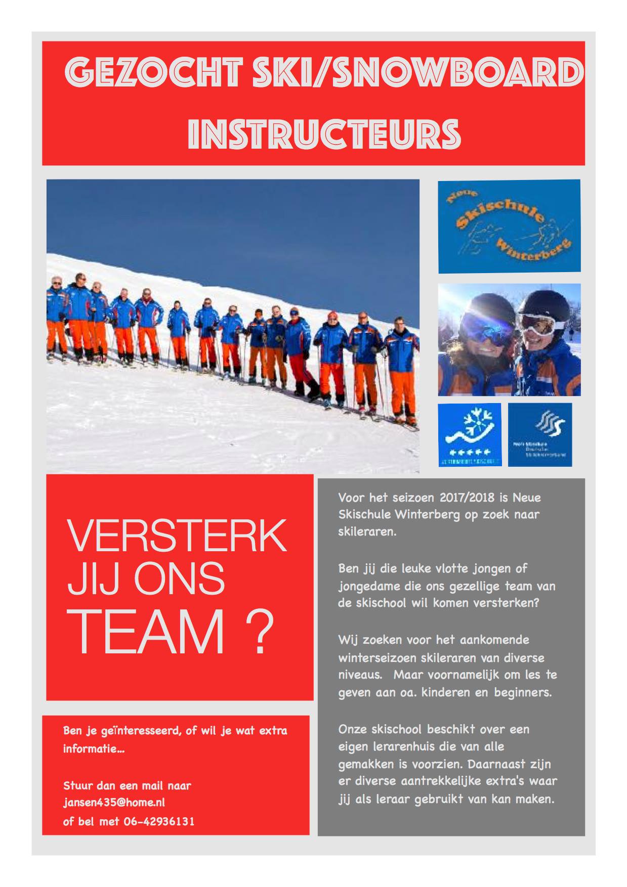Niet alleen Skischule Kahler Asten is op zoek naar skileraren, ook de collega’s van de Neue Skischule Winterberg zijn dat. Danny Jansen van de skischool vertelt: “Helaas merken we dit jaar, dat door aantrekkende economie en een lerarentekort in de Alpenlanden dat de leraren steeds vaker ervoor kiezen om naar de Alpenlanden te gaan. Dit vinden wij erg spijtig, aangezien we tot de modernste skigebieden van Europa behoren en wij als skischool altijd werk hebben voor goede gemotiveerde mensen.” Lijkt het je wat om daar te werken, bekijk dan de onderstaande poster en reageer.