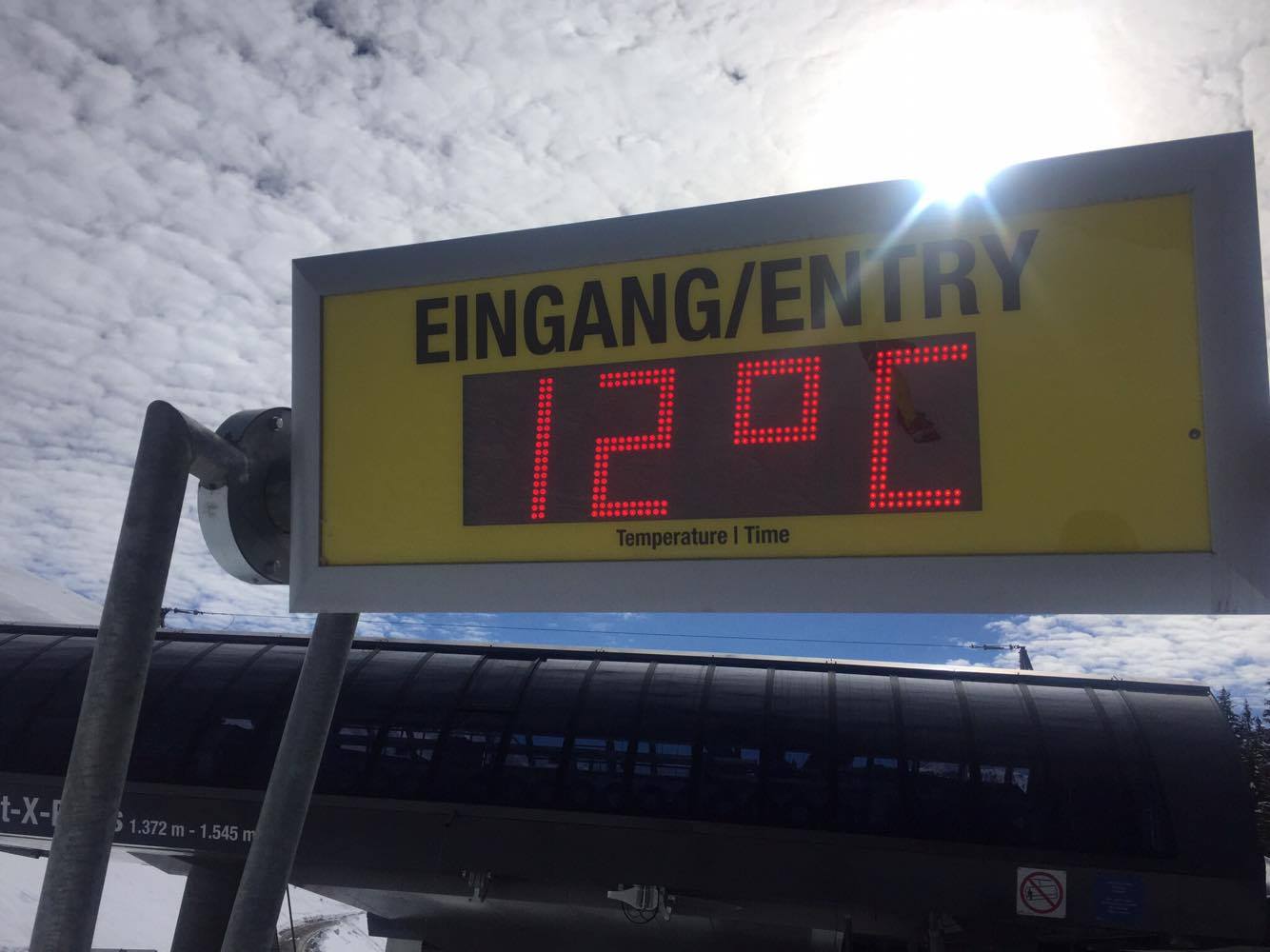De temperatuur gaat gedurende de week steeds een stukje omhoog. Dinsdag en woensdag stijgt het kwik naar maximaal 15 graden. Vrijdag wordt de warmste dag voorspeld met een temperatuur van +21. Naar alle waarschijnlijkheid blijven de pistes wel in goede condities, omdat in de nachten nog vorst verwacht wordt. Wil je profiteren van de lekkere pistes, dan is het aan te raden om vroeg de berg op te gaan.