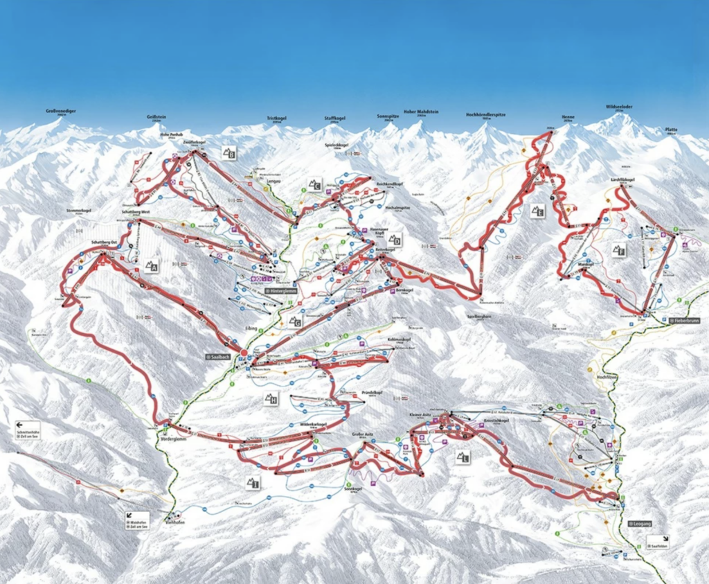 - Hinterglemmronde: 26 km lang, 67% blauwe en 33% rode pistes (tegen de klok in)