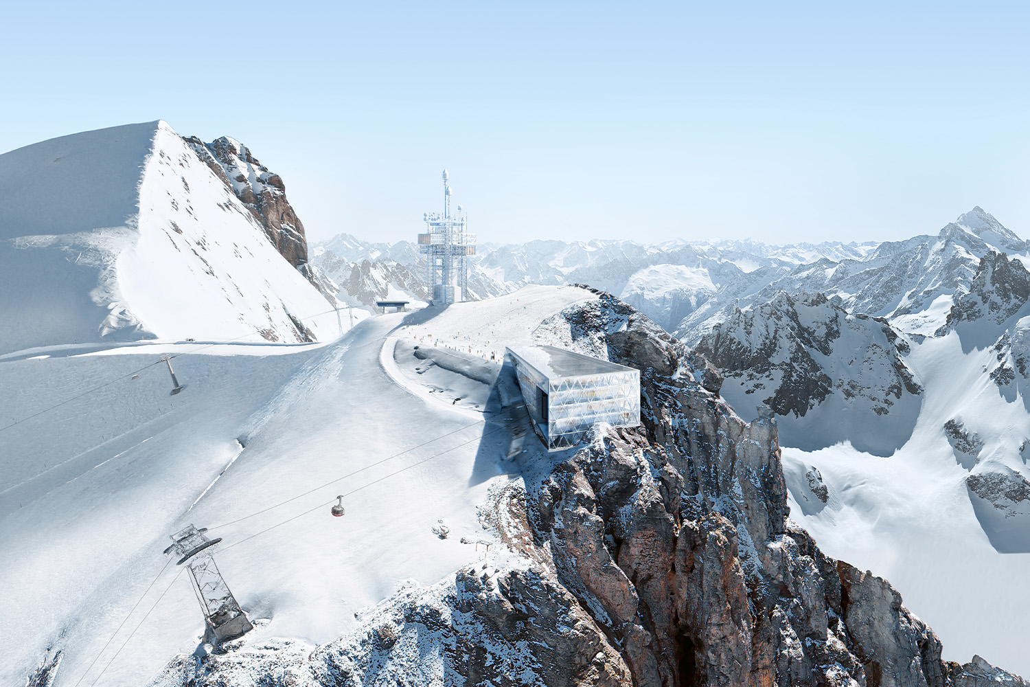 De toren op 3000 meter wordt het pronkstuk van het hele project in Engelberg-Titlis. Het is niet zomaar een toren, want dit wordt ook een restaurant, bar en lounge. Het liggende kruis net boven de helft van de toren maakt dit mogelijk. In totaal kunnen er in de toekomst 330 mensen plaatsnemen in de toren, verdeeld over twee verdiepingen. Het bestaande terras met prachtig uitzicht wordt uitgebreid tot een groter terras voor de bezoekers. Door de verbouwing krijgt de hele toren een nieuwe, opvallende en meer moderne look. Ondergronds is de toren verbonden door een tunnel met het nieuwe bergstation. Zo kun je in alle weersomstandigheden de toren veilig bereiken. Aan de noordkant komt ook een garage voor sneeuwruimers.