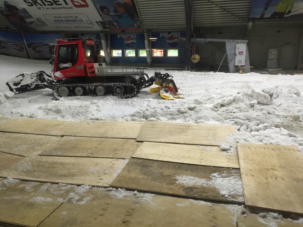 Skileraar Levi Scholten nam gisteren een kijkje en stuurde de foto’s vanuit de hal door. De pistenbully draait overuren om in totaal twee miljoen kilo aan sneeuw te verspreiden en aan te stampen. Alle zeilen worden bijgezet om zo snel mogelijk open te kunnen. Levi vertelt: “Het funpark is nu weg. Die sneeuw wordt naar piste 3 gebracht. De rest wordt bij gespoten.”