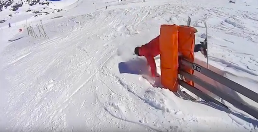 De skiër in de onderstaande video is blij dat de kussens rond het uiteinde van een houten hek waren geplaatst. Zijn stunt ging niet helemaal zoals gepland en hij stond op het punt een harde val te maken, maar gelukkig vingen de oranje kussens zijn harde val op.