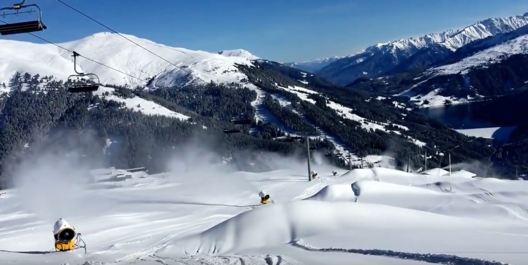 Op dit moment loeien de sneeuwkanonnen volop. Bovenop de vers gevallen sneeuw wordt kunstsneeuw gespoten om zo zeker weten genoeg sneeuw te hebben voor de winteropening op 2 december. De kunstsneeuw is compacter dan natuursneeuw en maakt daarom een betere ondergrond. Bovendien is het vooral in het voorseizoen: hoe meer sneeuw hoe beter.