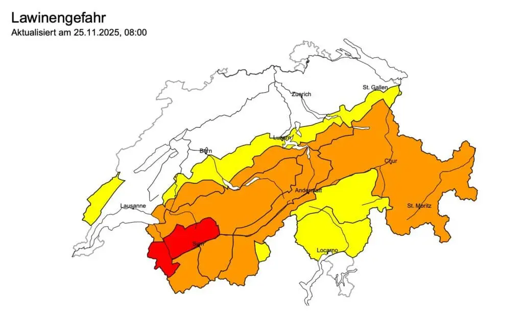 In Wallis is op diverse plekken sprake van een zeer grote kans op lawines. In Conthey-Fully en Monthey-Val d’Illiez is lawinegevaar schaal 4 van kracht, waarbij de kans lawinesituatie zeer kritiek is. De verse sneeuw die boven op de oude sneeuwlaag is gevallen zorgt, met name boven de 2200 meter, voor een instabiel sneeuwdek.