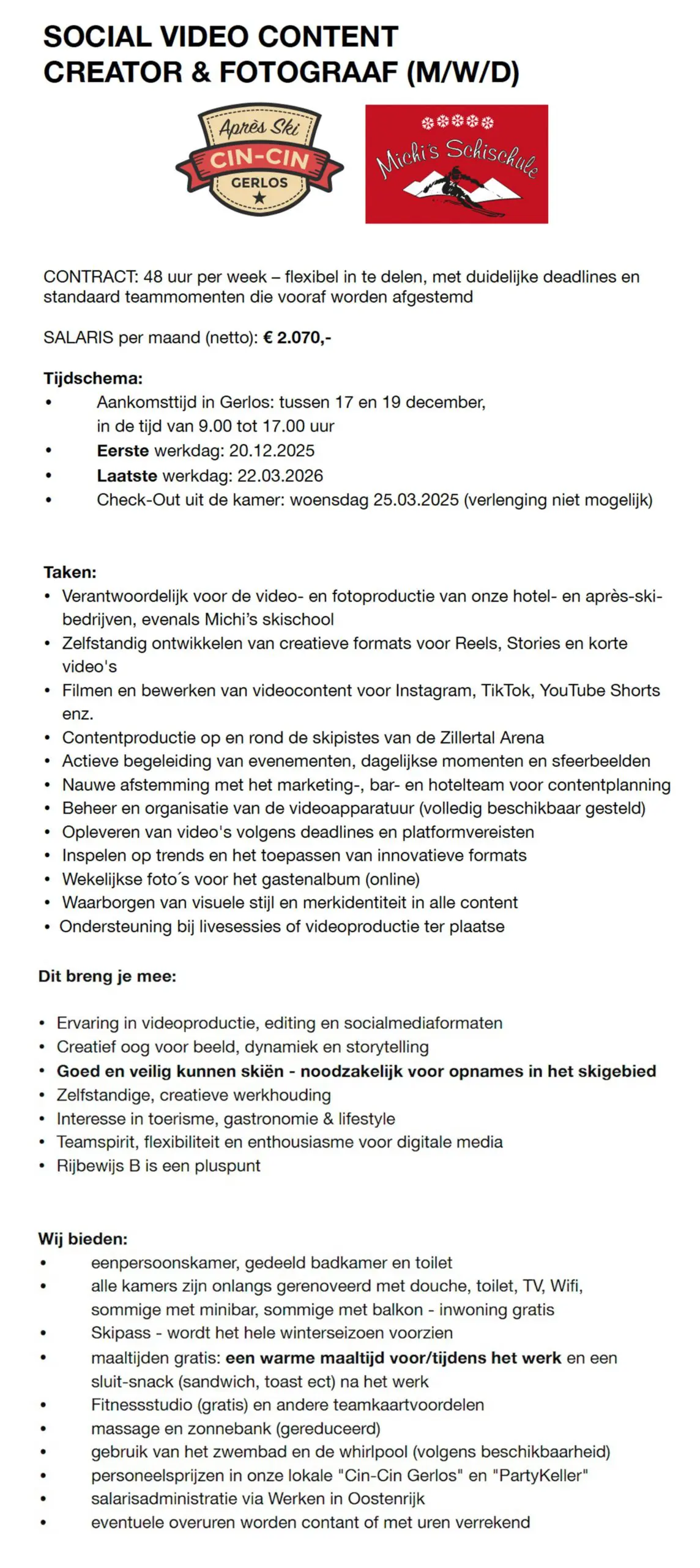De eerste is voor de après-ski liefhebber. De bekende après-ski bar Cin-Cin is op zoek naar een video content creator. Of eigenlijk is het een gedeelde vacature, want je maakt in deze rol ook content voor de hotelbedrijven en Michi’s skischool. Het is een veelzijdige baan dus. Wat je gaat doen? Je wordt onder andere verantwoordelijk voor de videoproducties, gaat zelfstandig creatieve formats ontwikkelen voor Reels, Stories en korte videos, maakt de content voor Instagram, TikTok en YouTube Shorts, schiet content op de piste, begeleid evenementen en nog veel meer. De complete vacature vind je hier. Klinkt leuk? Solliciteren doe je via [email protected].