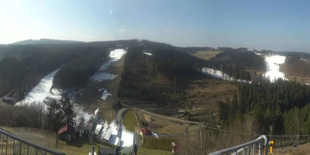Kijk je even wat verder dan de foto’s die het skigebied deelt en de webcams met wat sneeuw, dan zie je duidelijk dat het echt geen hartje winter is in Winterberg. Het is voorjaar en er liggen slechts een paar witte stroken sneeuw. Verwacht dus zeker geen winterskiën als je bedenkt om die kant op te gaan.